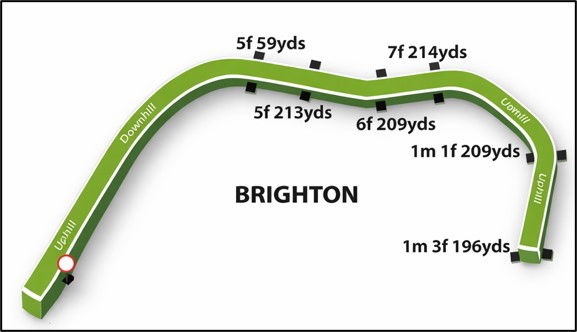 Course Information: Brighton Racecourse is a peculiar track and one of the very few racecourses in Great Britain where it is not a full circuit (can you name the other three?). It is around 12-furlongs in length, a horseshoe-shaped, left-handed track that has several pronounced gradients and sharp turns. It has been compared to Epsom, with a left-handed dog-leg turn, and one of the steepest descents of any British track.