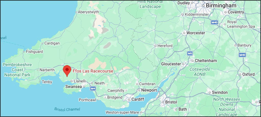 By Road: The racecourse is situated just off the A484 between Llanelli and Carmarthen. If travelling from the east: take Junction 48 (M4) joining the A4138 to Llanelli and follow brown racecourse signs. It is approximately 15 minutes after leaving the motorway. From the west, follow A40 to Carmarthen, then A484 to Llanelli and follow brown racecourse signs. Use the postcode SA17 4DE in your Sat-Nav. If you are driving cross-country from the Midlands, it is a difficult drive once you hit Wales, with numerous 20 mph limit areas, speed bumps and cameras everywhere.