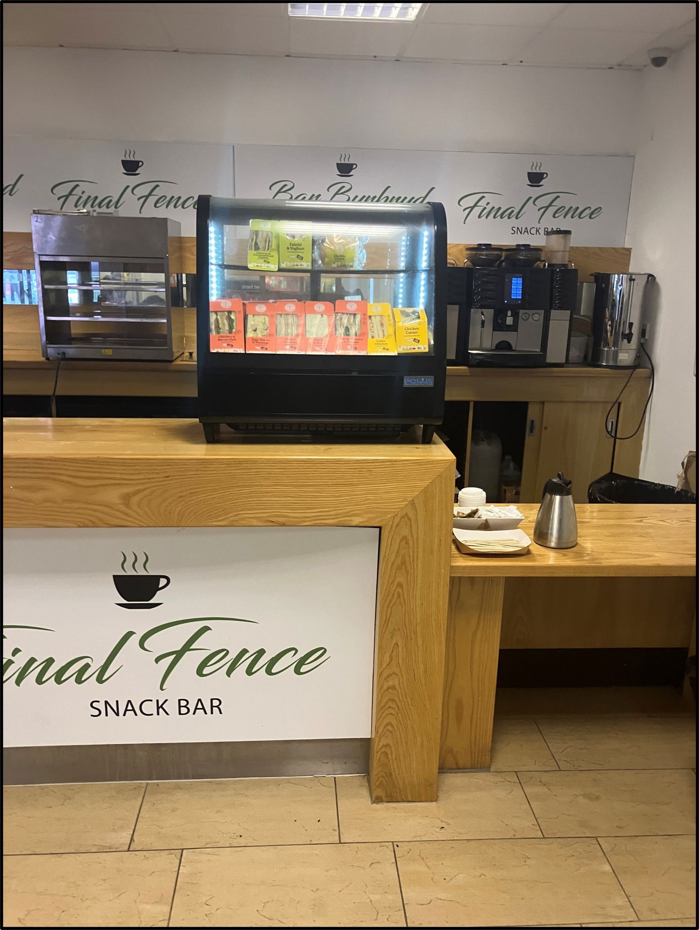 At the right-hand side of Blinkers Bar, which is situated in the main grandstand, is the Final Fence snack bar. It sold a limited range of sandwiches, salads, pies, chocolate bars and crisps. However, on the day of our visit, there were no salads, pies, chocolate bars or crisps available. Just a sad-looking variety of sandwiches at £4.50 each. It also sold tea, coffee, and hot chocolate, priced from £2.10 to £3.00 depending on your selection. And that was it.