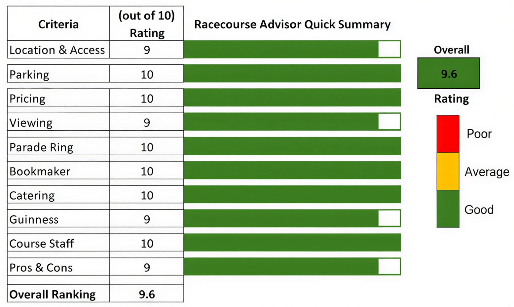 The long list of Pros really does mean this is a top-class course for us. Fantastic viewing on all counts, tremendous choice of catering and quality options at that, easy access, plentiful parking, high-quality racing, and you get all this for an admission price that pleasantly surprised us! Rating: 9/10.