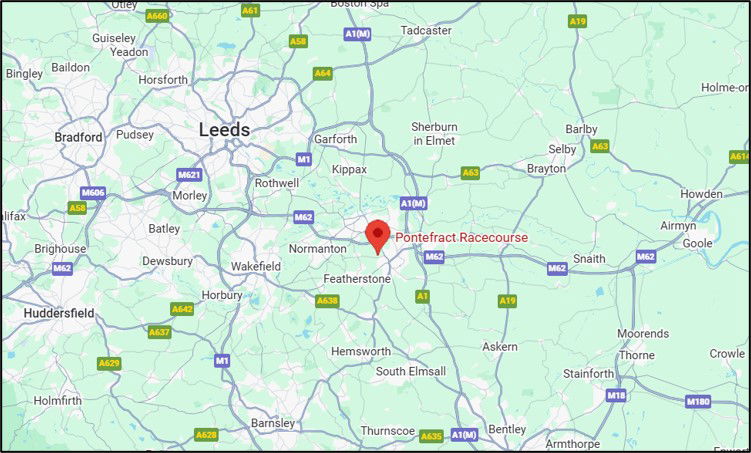 The racecourse is situated in the town of Pontefract in the county of West Yorkshire, immediately off the M62 motorway.