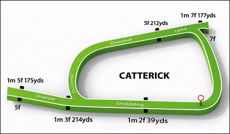 Course Information: Catterick is a dual-purpose (flat & jumps) left-handed, oval-shaped course of around nine furlongs in circumference and has a three-furlong straight. It is downhill all the way home from the 7-furlong post and has a sharp turn as the horses enter the straight for the run home.